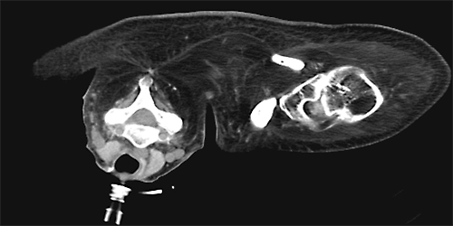 気管切開にて呼吸管理,ADL全介助,肩関節自動運動不能.