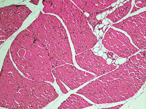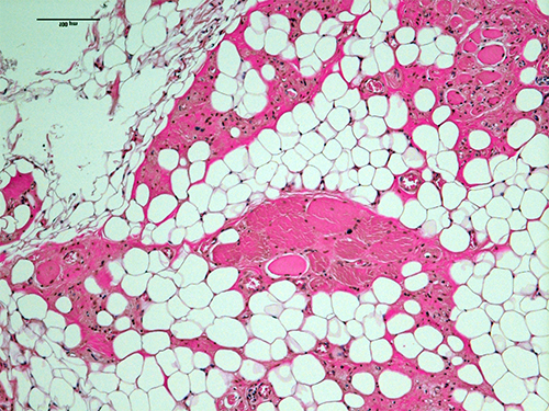 著明な脂肪変性を認めるが,筋線維も一部残存,血管組織は保存される.