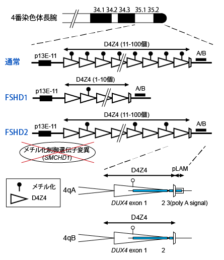4q35は染色体の端に位置するため、通常は強くメチル化されていてその部位の遺伝子は発現しません。メチル化が低下する因子として、通常は11-100回あるD4Z4が1-10回に短縮した場合(FSHD1)、メチル化制御遺伝子(SMCHD1, DNMT3B, LRIF1など)の変異が生じた場合(FSHD2)、が知られています。